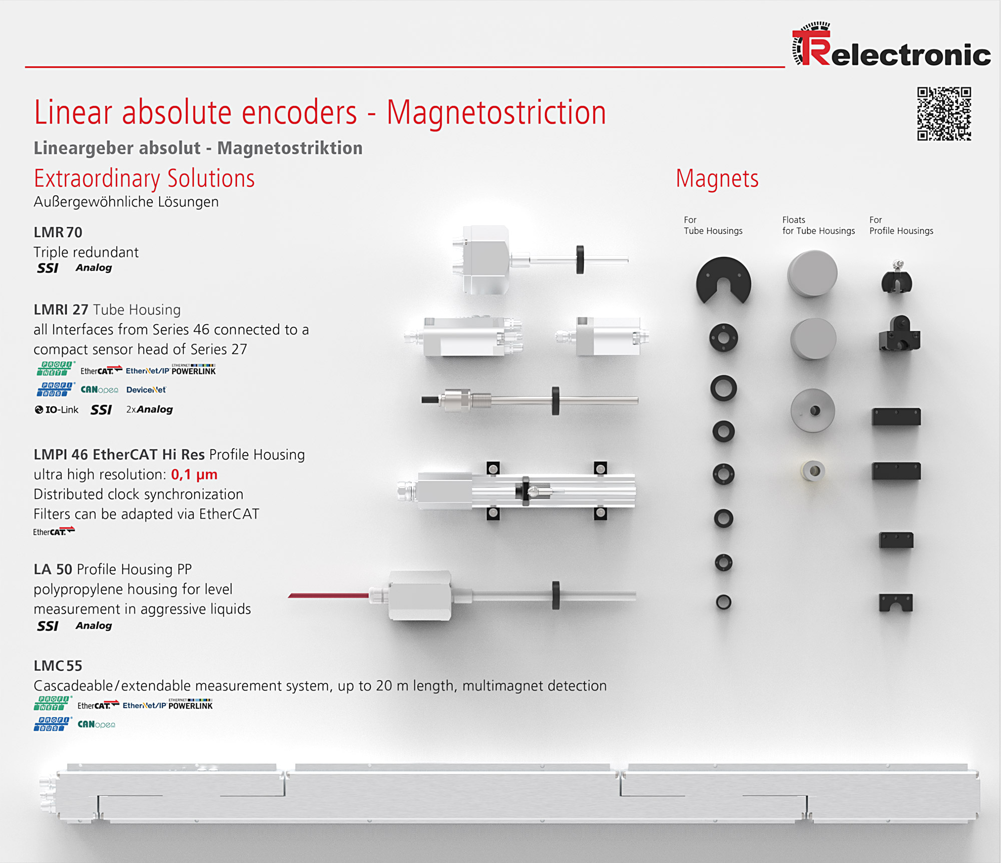 Und mit kaskardierbaren linear-absoluten Wegsensoren im Profilgehäuse lassen sich sogar Messlängen von bis zu 20 m erreichen – beispielsweise zur Messerverstellung in Rollenschneidmaschinen oder als verschleißfreie Vertikalachsen in Hochregallagern.